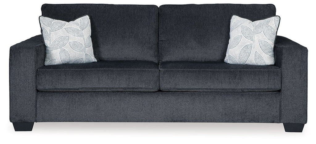 If style is the question, then this sofa is the answer. Sporting clean lines and sleek track arms, the decidedly contemporary profile is enhanced with plump cushioning and a chenille-feel upholstery that's so pleasing to the touch. Sure to play well with so many color schemes, this sofa in slate gray includes a pair of understated floral pattern pillows for fashionably fresh appeal.