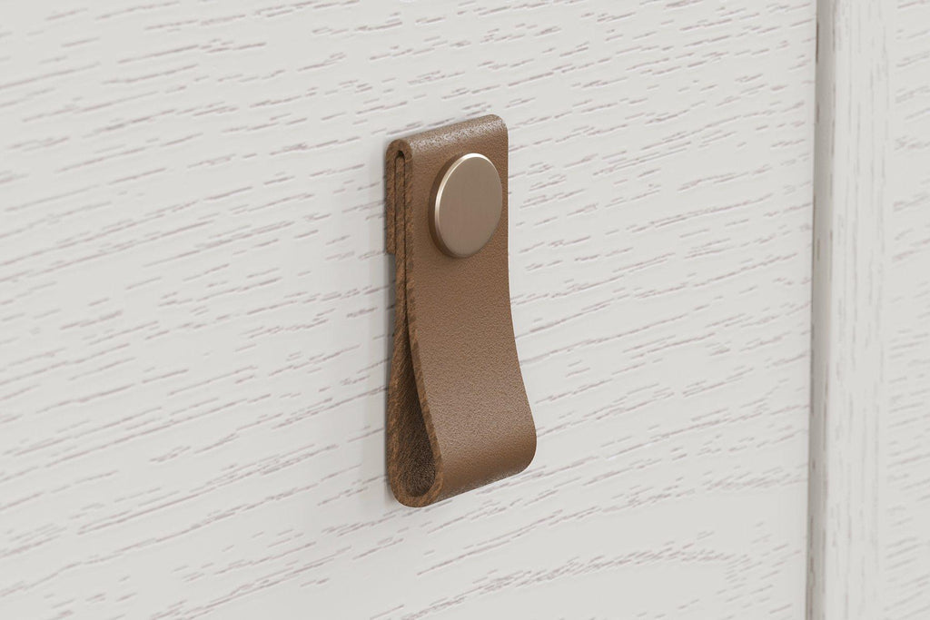 • Faux leather drawer pulls with brass-tone rivets; light brown and gray options included
