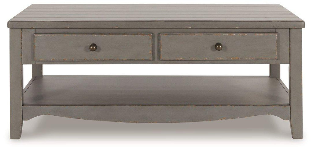 Put your love of European farmhouse styling on display. Finished with an antiqued gray chipped paint effect for an authentic vintage look, this coffee table is loaded with character. Two drawers and an open display shelf allow for storage and easy access to books, beverages and more.