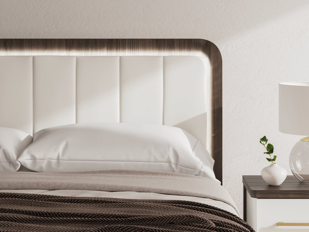 Looking to make a subtly striking statement in your bedroom? We've got you covered. This queen upholstered bed’s sophisticated two-tone treatment marries a warm brown finish over replicated walnut grain with a matte white finish. Highlighted with a wonderful white faux leather, the headboard features warm ambient lighting for that cozy feeling we all love at bedtime. Rounded corners radiate an air of modern panache. It’s a master class in contemporary yet comfortable character.