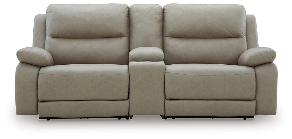 Experience ultimate comfort with this power reclining sectional. Generously cushioned with plush bustle back styling and pillow top track arms, it's wrapped in a richly neutral upholstery that’s oh-so soft. Jumbo stitching gives the sectional added definition. A one-touch power control and USB charging take the pleasure of reclining to a higher level.
