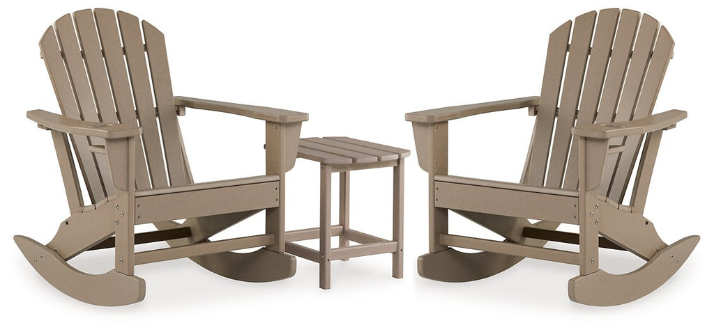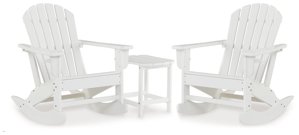 Add cottage-quaint charm to your outdoor oasis with this rocking chair and table set. Made of MEGA TUFF™ high-density polyethylene material, it’s sure to weather the seasons beautifully. Designed to shed rainwater, the slatted styling and classic Adirondack design provide exceptional form and function.